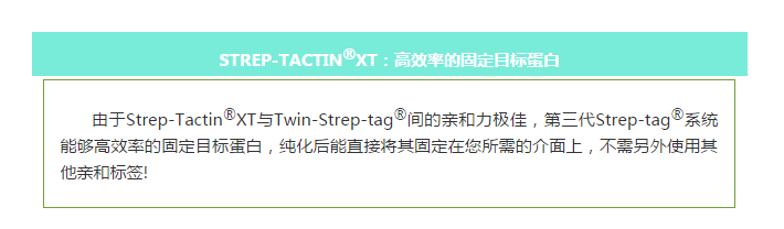 Strep-tag?是IBA life sciences基于生物素(Biotin)和鏈霉親和素(Streptavidin)之間的結(jié)合反應(yīng)開(kāi)發(fā)的蛋白純化系統(tǒng)。第三代Strep-tag?系統(tǒng):「Strep-Tactin?XT:Twin-Strep-tag?」蛋白純化系統(tǒng),其結(jié)合力可達(dá)pM級(jí)別但仍保持結(jié)合的可逆性和固定化蛋白的溫和復(fù)蘇能力。因此,用Strep-Tactin?XT 系統(tǒng)能有效提高您目標(biāo)蛋白的純度,解決您實(shí)驗(yàn)中所遇到的常見(jiàn)問(wèn)題。