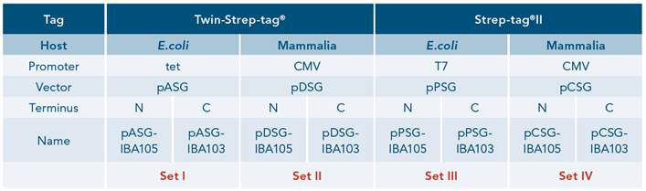 SetⅠ與SetⅡ?yàn)門(mén)win-Strep-tag?(三代純化標(biāo)簽),SetⅢ與SetⅣ為Strep-tag?II(二代純化系統(tǒng))標(biāo)簽。每組載體包含兩個(gè)1μg帶Amp抗性的載體,分別為Tag在N-Term或C-Term的載體