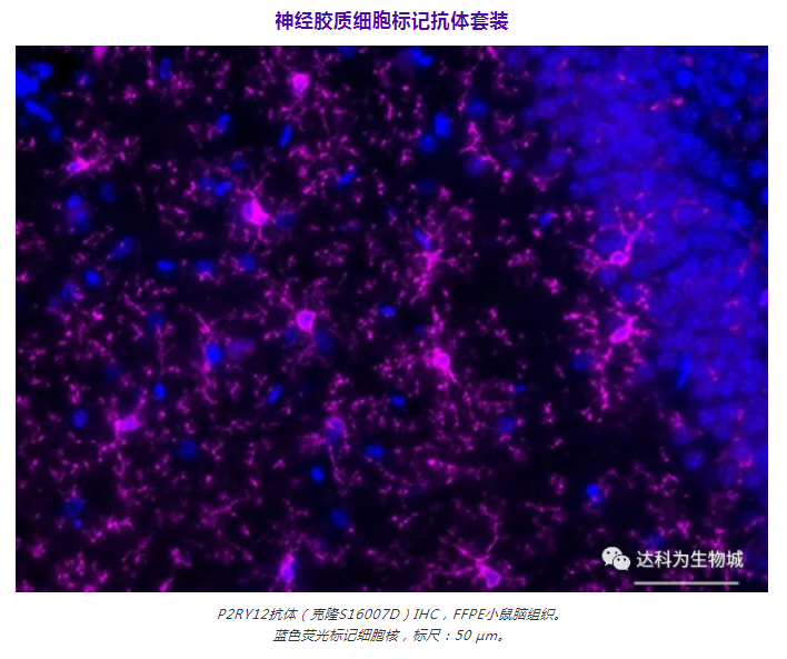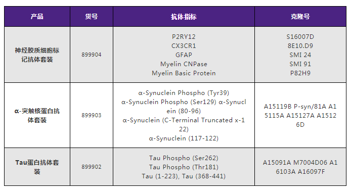 神經(jīng)膠質(zhì)細(xì)胞抗體套裝中包含檢測(cè)常見(jiàn)神經(jīng)膠質(zhì)細(xì)胞的標(biāo)記物,如趨化因子受體1抗體(CX3CR1)、膠質(zhì)纖維酸性蛋白(GFAP)、髓磷脂(Myelin)和嘌呤能受體(P2RY12)。其中的輔助試劑可以檢測(cè)各種屬磷酸化或總α-突觸核蛋白/Tau,這些聚集物與阿爾茨海默癥和帕金森皆有重大關(guān)聯(lián)。