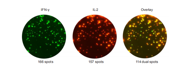 FluoroSpot能夠分析抗原特異性的多功能T細(xì)胞,例如,IFN-γ和IL-2的分析。三明治夾心結(jié)構(gòu)在熒光斑點(diǎn)中得以應(yīng)用,不同特異性的單克隆捕獲抗體混合物被包被于96孔板的PVDF膜上,生物素標(biāo)記的檢測抗體識別一種分泌物,tag標(biāo)記的檢測抗體識別其它的分泌物來實(shí)現(xiàn)雙色或三色細(xì)胞因子分泌細(xì)胞的檢測。檢測通過帶有特定熒光基團(tuán)的共軛試劑放大信號斑點(diǎn),可用自動讀板器進(jìn)行分析。