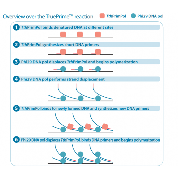 TruePrime?采用MDA技術(shù),基于新型的TthPrimPol 引物酶和Phi29 DNA聚合酶,擴(kuò)增過程無需添加隨機(jī)引物,減少了擴(kuò)增偏倚,提高了擴(kuò)增過程的覆蓋率和保真性,并且對于污染的外源DNA不敏感,可重復(fù)性好。TruePrime?可用于單個細(xì)胞或少量細(xì)胞的全基因組擴(kuò)增,與常見的NGS平臺如Illumina和IonTorrent等兼容性良好。