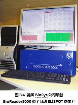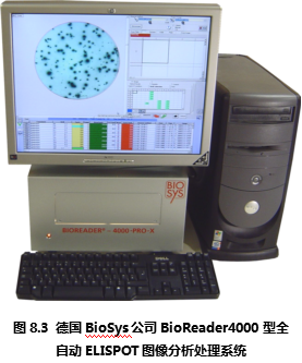 德國Bio-Sys公司從上世紀(jì)80年代開始就致力于生物圖像識(shí)別領(lǐng)域,在進(jìn)入ELISPOT圖像分析儀市場后一直以其先進(jìn)的ELISPOT斑點(diǎn)識(shí)別技術(shù)聞名。德國Bio-Sys公司首先解決了顯微攝像系統(tǒng)難以定位96孔板上的每一個(gè)孔的問題。其解決方法基于圖像識(shí)別技術(shù),利用板孔邊壁和真正的孔底的細(xì)微差別,在機(jī)械定位的基礎(chǔ)上,通過軟件識(shí)別來進(jìn)一步提高每孔的定位精度。是目前市場上所有ELISPOT圖像分析儀中唯一能夠完整識(shí)別整個(gè)孔底ELISPOT斑點(diǎn)圖像的設(shè)備。在對真假斑點(diǎn)的分辨中,德國Bio-Sys公司除了具備完善的物理學(xué)多參數(shù)識(shí)別技術(shù),還特別針對ELISPOT斑點(diǎn)形成的生物學(xué)過程,通過細(xì)胞因子顯色后的“光密度”峰值積分分析方法,精確分辨真假斑點(diǎn)、融合斑點(diǎn)等復(fù)雜情況。Bioreader系列ELISPOT圖像分析儀國外大多數(shù)較有經(jīng)驗(yàn)的ELISPOT實(shí)驗(yàn)室推崇的特點(diǎn)為:專業(yè)性和參數(shù)全開放性。因?yàn)镋LISPOT實(shí)驗(yàn)的復(fù)雜性,ELISPOT斑點(diǎn)形成在不同的實(shí)驗(yàn)條件下有非常大的差異。這就對ELISPOT圖像分析儀提出了較高的要求:既要能夠保證斑點(diǎn)計(jì)數(shù)的真實(shí)性和一致性,又要能夠根據(jù)不同情況,通過實(shí)驗(yàn)者的判斷來校正儀器對ELISPOT斑點(diǎn)識(shí)別的標(biāo)準(zhǔn)。要同時(shí)實(shí)現(xiàn)以上兩個(gè)要求,唯一的辦法是將儀器的所有判斷標(biāo)準(zhǔn)向ELISPOT實(shí)驗(yàn)者開放,實(shí)現(xiàn)實(shí)驗(yàn)者和儀器的互動(dòng)。在這一方面,德國Bio-Sys公司始終走在ELISPOT斑點(diǎn)識(shí)別領(lǐng)域的前列,新的Bioreader-4000型(圖8.3)和Bioreader -5000(圖8.4) 型在專業(yè)性和適用性方面都領(lǐng)先于其他廠家的設(shè)備。