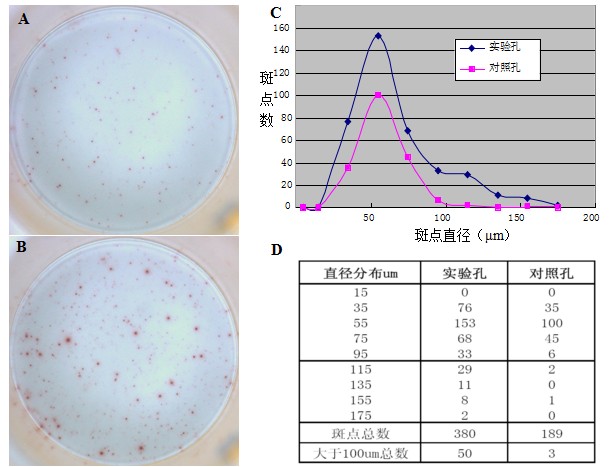 由于有了充足的信息與理由,我們可以在最后斑點(diǎn)計(jì)數(shù)的時(shí)候,把斑點(diǎn)直徑的閾值設(shè)定為100μm:我們只計(jì)數(shù)大于100μm的斑點(diǎn),小于100μm的斑點(diǎn)不予計(jì)數(shù)。這樣負(fù)對照孔與實(shí)驗(yàn)孔的最終結(jié)果為3:50,相差有17倍!這比最初相差一倍的結(jié)果顯著得多。