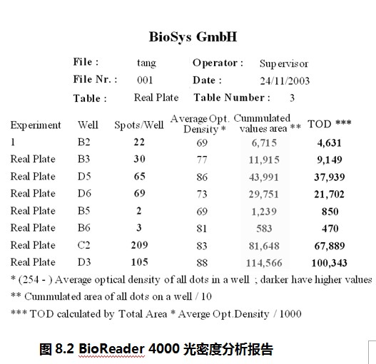 如圖8.2所示,這是BioReader 4000光密度分析報(bào)告。它可以提供的信息有:孔的位置、每孔的斑點(diǎn)數(shù)目、該孔斑點(diǎn)的平均光密度(Average Opt. Density)、該孔斑點(diǎn)的總面積(Cumulated values area)、該孔相對細(xì)胞因子分泌總量(TOD,即光密度總值)。