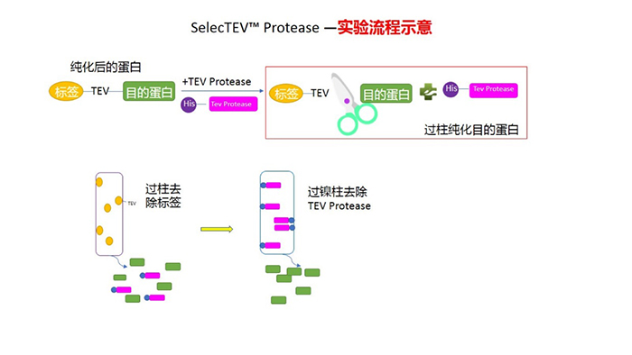 SelecTEV?蛋白酶是一種基因工程改造的煙草蝕刻病毒(TEV)蛋白酶,通過His標(biāo)簽的親和層析從大腸桿菌中純化,SDS-PAGE分析表明其純度為90%。SelecTEV?蛋白酶能夠識別Glu-Asn-Leu-Tyr-Phe-Gln-Gly七個氨基酸以及與其密切相關(guān)的序列,并在Gln和Gly殘基之間進(jìn)行切割。 這七種氨基酸序列在蛋白質(zhì)中很少見,使得SelecTEV?蛋白酶成為從融合蛋白中去除標(biāo)簽的理想選擇。利用蛋白酶N-末端的His標(biāo)簽通過親和層析即可從酶切反應(yīng)中除去SelecTEV?蛋白酶。