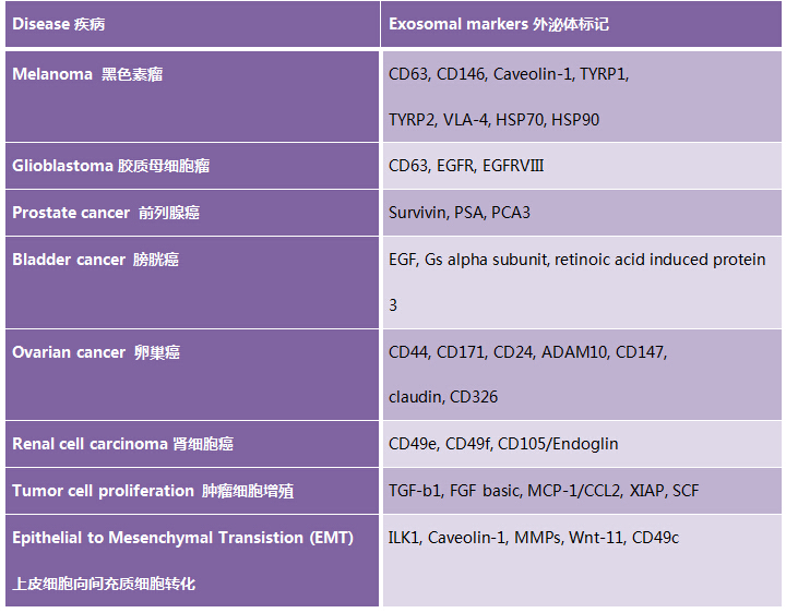 腫瘤細胞和它們的環(huán)境之間的直接作用之所以在腫瘤發(fā)展進程中至關重要,其中重要的原因就是外泌體在細胞間信號傳遞中起關鍵作用。釋放到細胞外環(huán)境的外泌體可以促進血管生成,腫瘤細胞增殖以及血栓形成,除此之外還有細胞外基質的重塑。下面表格中列舉了常見腫瘤的一些外泌體標記。